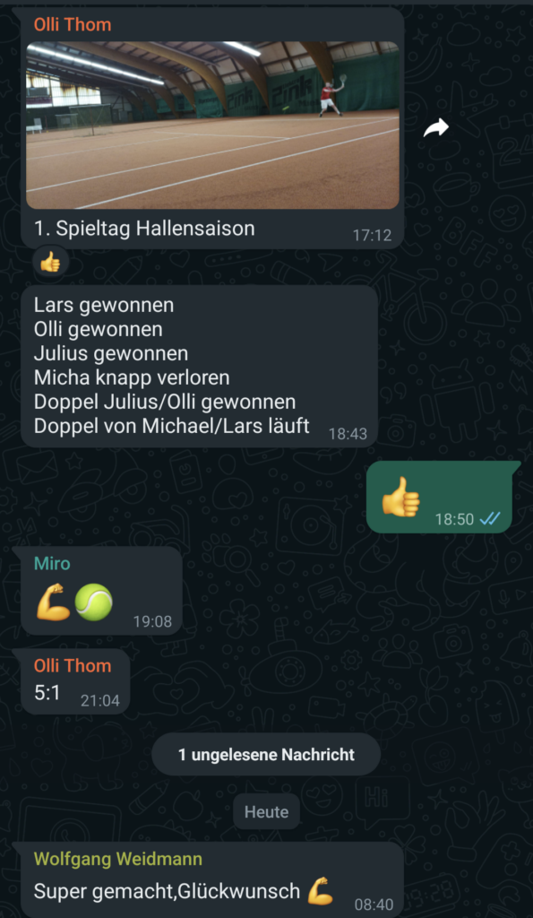 An Position 1 hatte Larry zwar einen großen Kampf geliefert aber leider im Match Tiebreak verloren. An Position 2 hatte Heiko souverän sein Spiel gewonnen. An Position 3 spielte Matthias: Im zweiten Satz beim Stand von 5:4 musste sein Spiel wegen seiner Verletzung leider abgebrochen werden. Sehr Schade! Das wäre der Punkt zum Sieg gewesen.