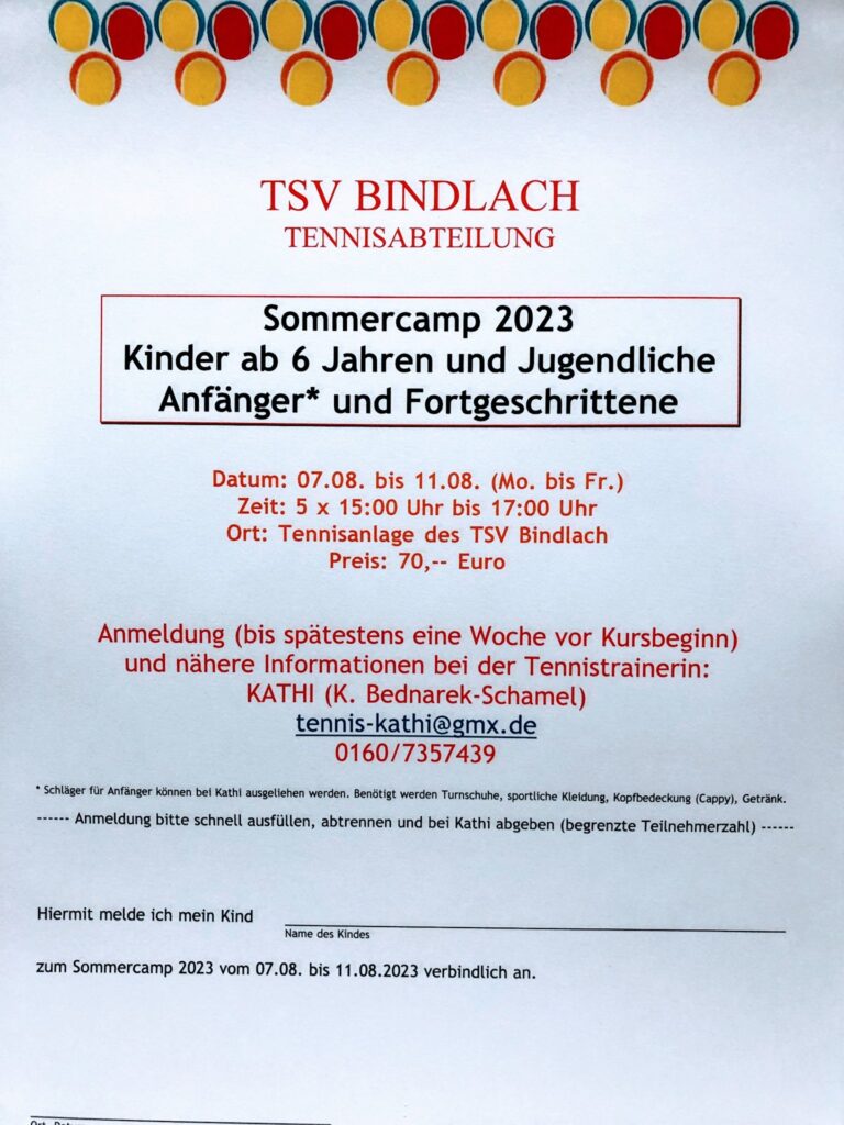 Sommercamp 2023 für Kinder ab 6 Jahren, Jugendliche Anfänger* und Fortgeschrittene Datum: 07.08. bis 11.08. (Mo. bis Fr.) Zeit: 5 x 15:00 Uhr bis 17:00 Uhr Ort: Tennisanlage des TSV Bindlach Preis: 70,– Euro Anmeldung (bis spätestens eine Woche vor Kursbeginn) und nähere Informationen bei der Tennistrainerin: Kathi (K. Bednarek-Schamel) tennis-kathi@gmx.de, Tel.: 0160 / 7357439